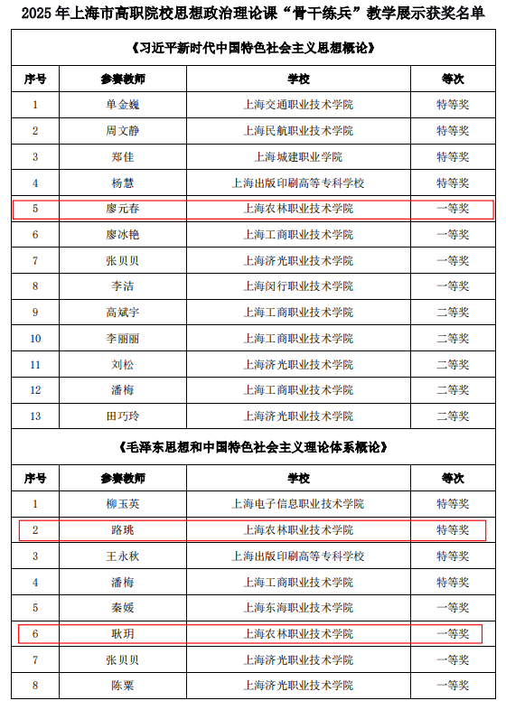 近日,上海高职高专思想政治理论课建设联盟、上海高校思政课教指委高职高专分委联合公布了2025 年上海市高职院校思想政治理论课“萌新磨课、骨干练兵”教学展示获奖结果,我院马院教师获“骨干练兵”组特等奖1项、一等奖2项,充分展现了我院马院教师在教学能力上的积累和成长。